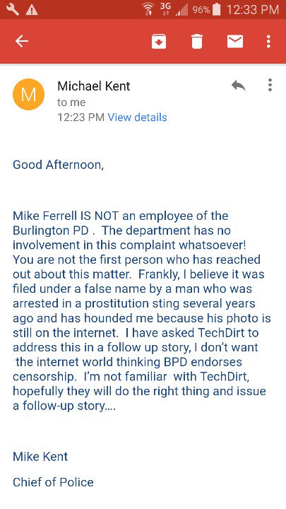 So… that leaves open the question of just who is impersonating the Burlington Police Department, and filing completely bogus DMCA notices in an attempt to censor news stories. It would seem that the most obvious options are those who were featured in those stories about arrests in Burlington. The very first notice that Ferrell sent, focused on stories about a particular prostitution sting, and named the nine men who were arrested, along with mugshots. It would seem that perhaps one (or more!) of those nine men would have pretty strong incentives to seek to have those stories deleted from Google.