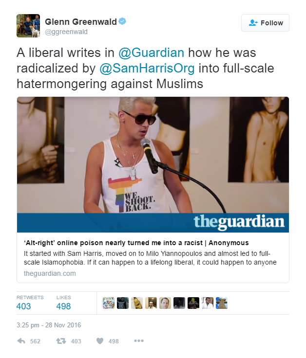 Perhaps owing to his success at hoodwinking the BBC, many on Twitter – including award-winning US writer and leading New Atheist Sam Harris, whose views on Islam are cited in the article as having helped lead the author to nearly becoming a racist – seemed to accept Elfwick’s claim of authorship at face value.