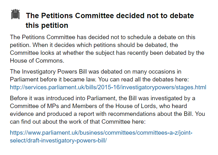 The website states “if a petition gets 100,000 signatures, it will be considered for debate in parliament”. Why then are we being told that the Petitions Committee is overruling this in the case of the Investigatory Powers Act petition?