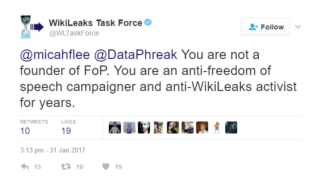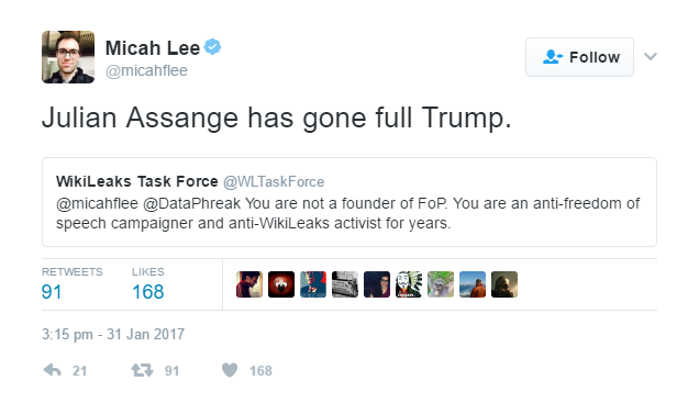 This was followed by a heated exchange between Lee and the WikiLeaks Task Force, an official WikiLeaks account set up in October 2016 to “correct misinformation” about its namesake organisation.
