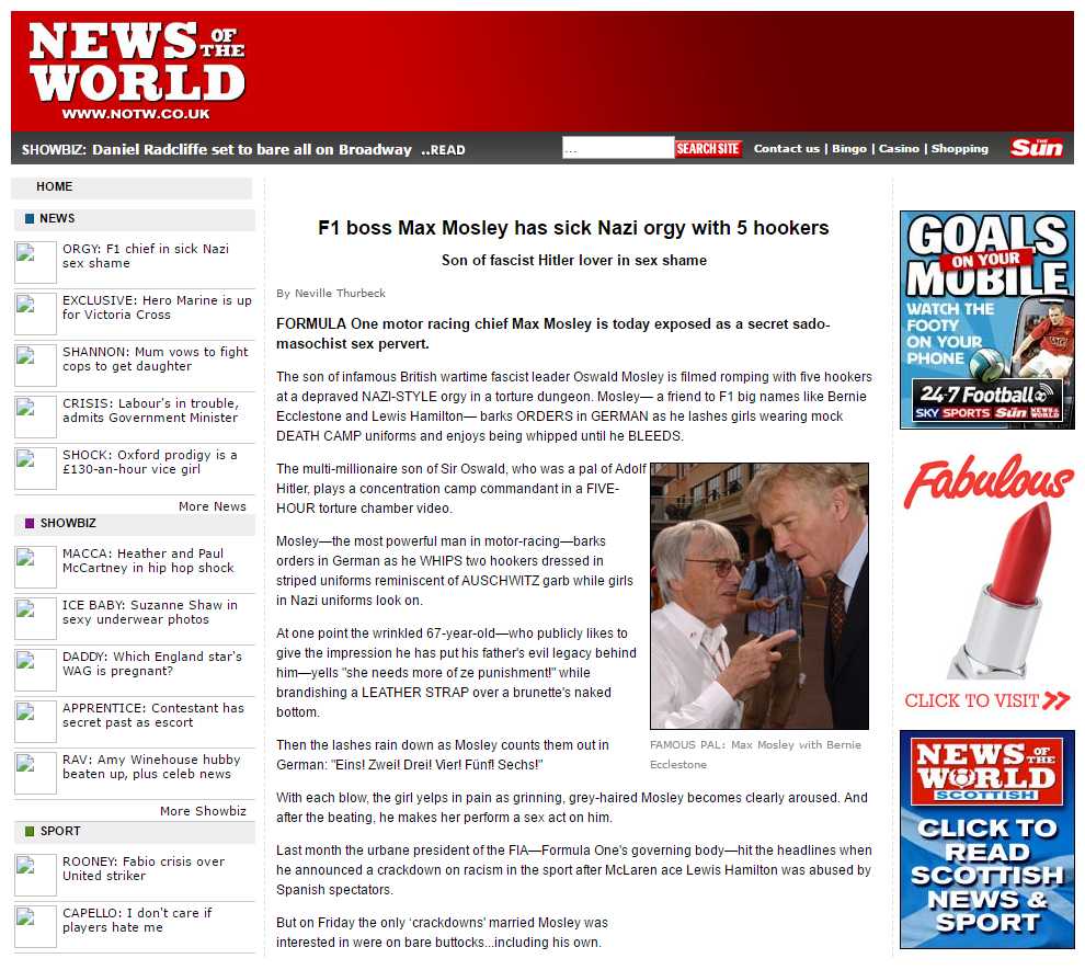 One controversial area of concern is the involvement of motor racing tycoon Max Mosley, son of notorious wartime fascist leader Sir Oswald Mosley.