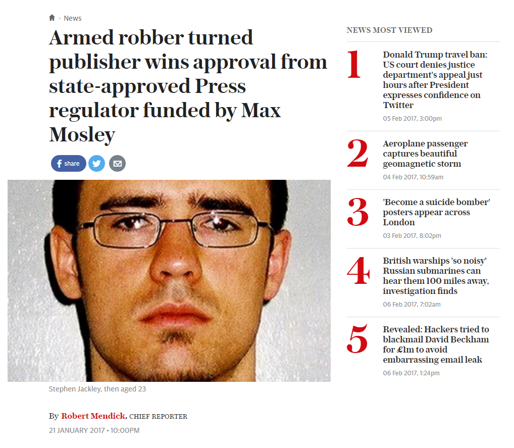 The January 21, 2017 article, “Armed robber turned publisher wins approval from state-approved Press regulator funded by Max Mosley” by the Sunday Telegraph’s chief reporter Robert Mendick, focused on McNought’s criminal past, namely a series of armed robberies he committed in 2007-08 for which he received a 12-year prison sentence.
