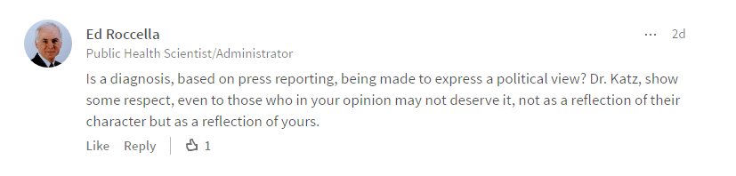 It’s not the first time Dr. Katz has been criticised for “offering a diagnosis…by remote observation” to “express a political view.”