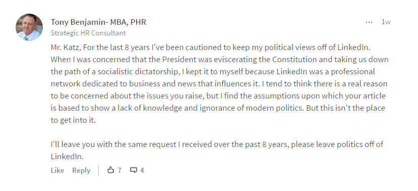 In a follow-up article, Dr. Katz addressed the backlash, stating he would not stop writing about politics: