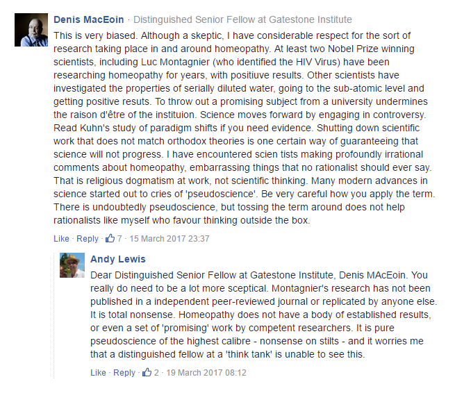 Denis MacEoin, a prominent analyst/writer from Belfast, Northern Ireland (coincidentally where I’m from), claimed that research into homeopathy had yielded positive results – a claim refuted by Quackometer blogger Andy Lewis: