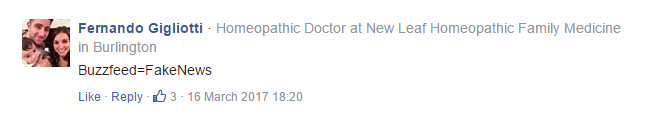 The Canadian homeopath Fernando Gigliotti simply wrote, “Buzzfeed=FakeNews”: