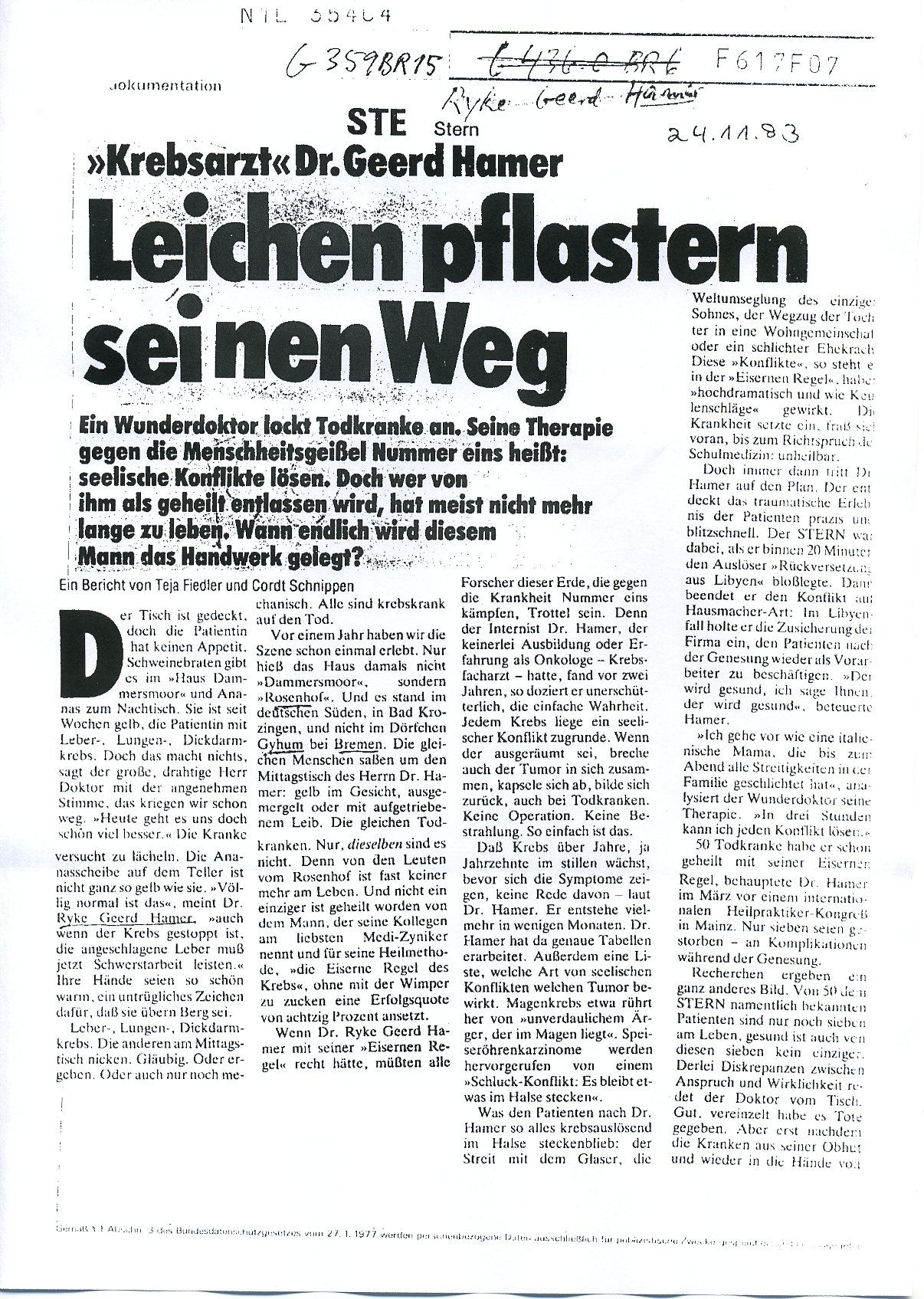 This commenter didn’t provide evidence for their claims, and I was unable to find the video interviews with Hamer’s surviving patients, but here’s a scan of a long-lost November 1983 Der Stern article about Hamer titled “Corpses Pave His Way,” which I grabbed before it disappeared from the Internet.