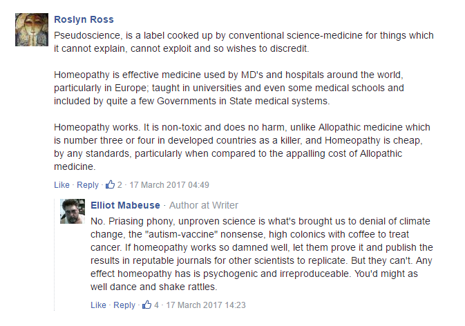 Homeopathy proponent Rosyln Ross wrote that “pseudo-science” is a derogatory label used by evidence-based science “for things which it cannot explain, cannot exploit and so wishes to discredit” – a claim rebutted by chemistry student/author Dr. Elliot Mabeuse: