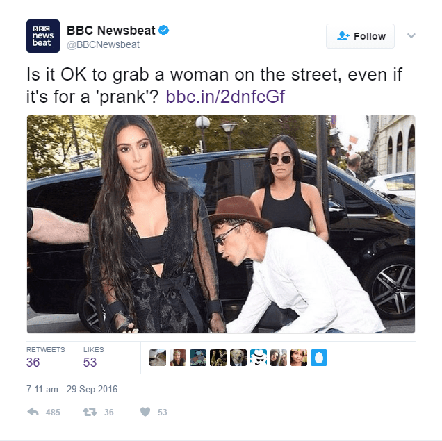 It isn’t the first time the BBC has apologised for asking “clickbait rhetorical questions” and “legitimizing an indefensible POV” – as award-winning British author Joanne Harris (MBE) charged in response to this September 2016 tweet by BBC Newsbeat re: video of US reality television star Kim Kardashian being accosted by “vile” Ukrainian prankster Vitalii Sediuk.