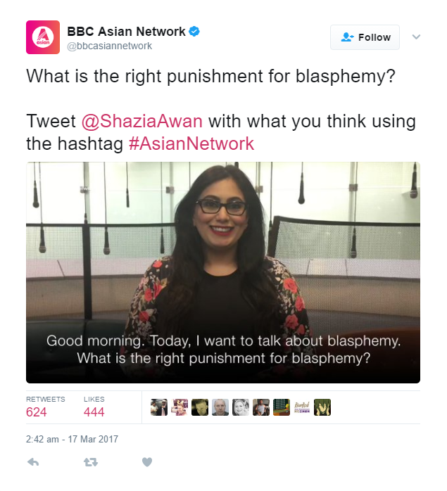Last week, the BBC Asian Network – which hosts the lively Big Debate radio programme – asked Twitter users to say what they thought was the “right punishment for blasphemy.”
