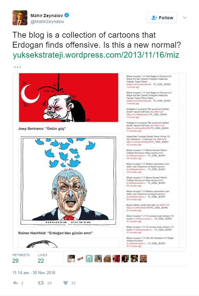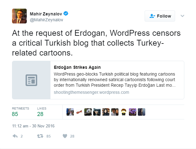In a series of tweets, the Turkish journalist and noted Erdoğan critic, Mahir Zeynalov, questioned WordPress’ decision to censor the blog.