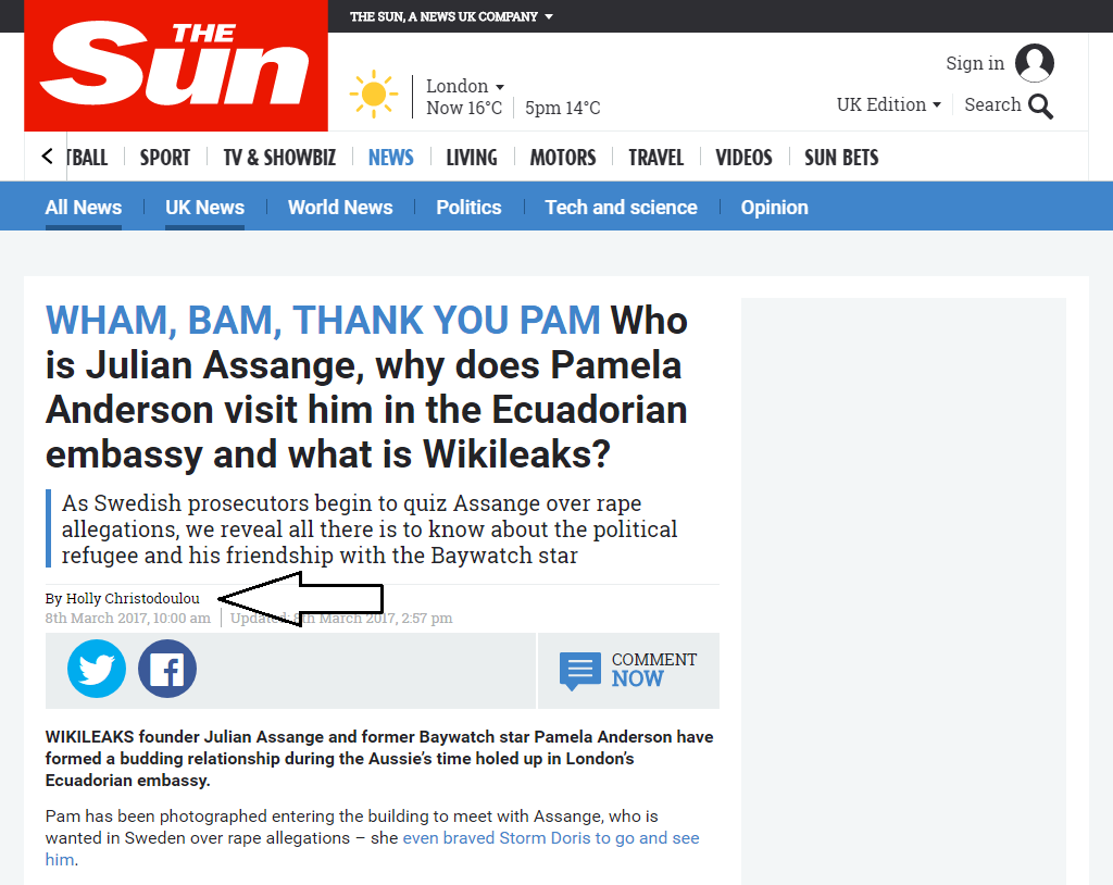 I recently blogged about a March 8, 2017 article published in the Rupert Murdoch-owned tabloid newspaper The Sun, “Who is Julian Assange, why does Pamela Anderson visit him in the Ecuadorian embassy and what is Wikileaks?” by Holly Christodoulou.