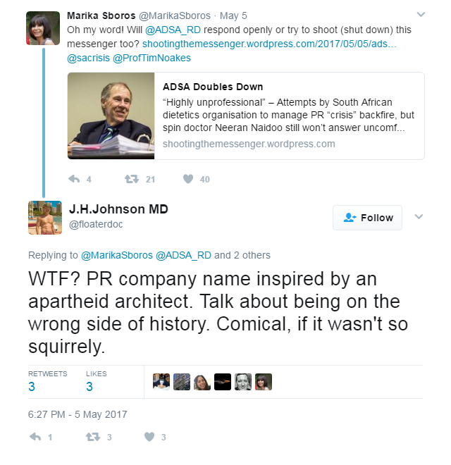 I recently blogged about the Association for Dietetics in South Africa (ADSA), whose former president reported University of Capetown professor Tim Noakes to medical authorities for a single tweet in February 2014 (click here to read more).