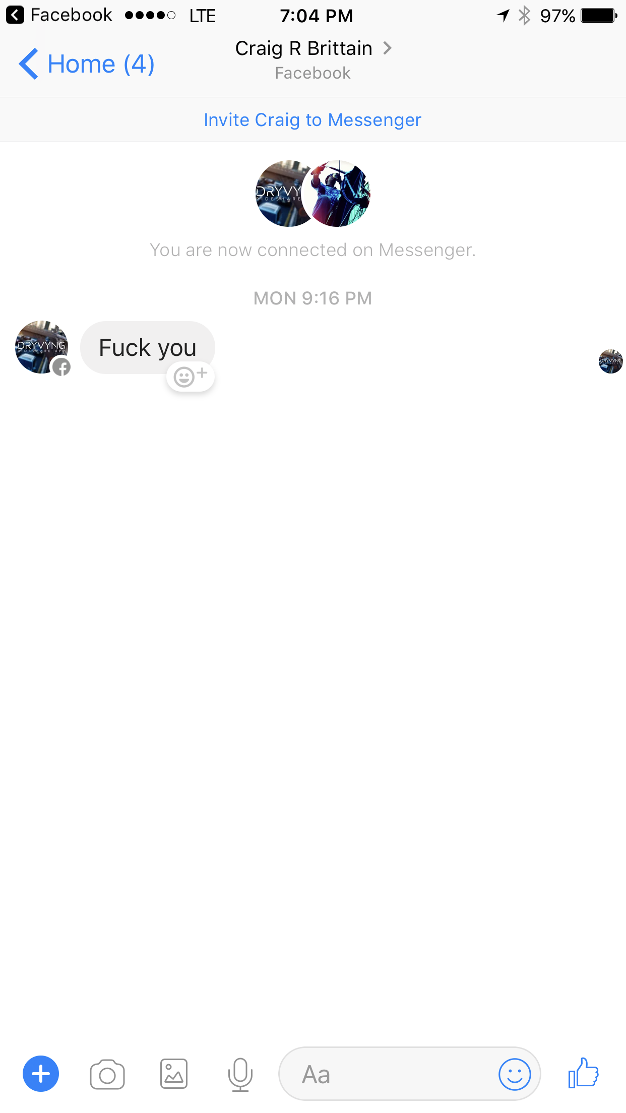 Dean: Hi, my name’s Dean, I’m a blogger. Recently I got an e-mail from a communications executive named Brian O’Neal who said you sent him a “profanity-laced” Facebook message because he unfollowed your Dryvyng page. For an item on my blog, could you comment on O’Neal’s claim? Cheers – Dean