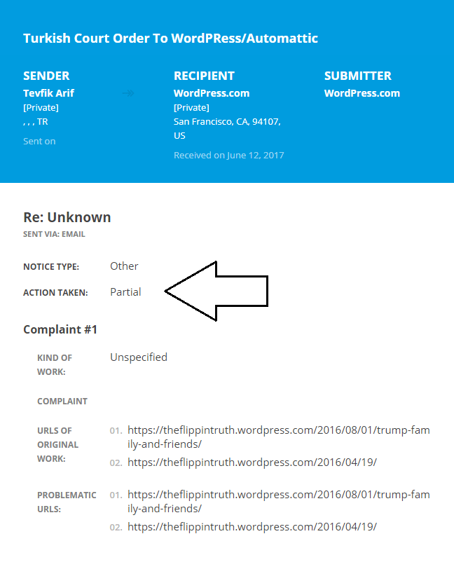 While Google doesn’t appear to have honoured Arif’s demand, Automattic told Lumen it has taken “partial” action against a critical WordPress blog that reported about Trump’s dubious friendships and business relationships, including his partnership with Arif.