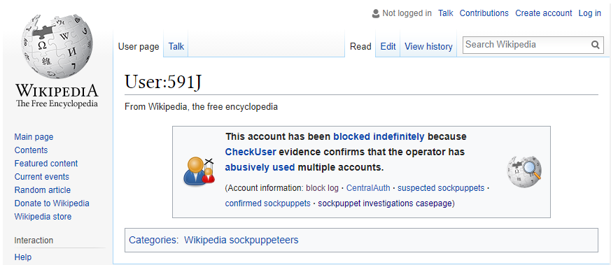 In April 2016, 591J was “blocked indefinitely” after an investigation by admins determined 591J had “abusively used” multiple accounts to promote Sater and delete information about which 591J had an undisclosed conflict of interest.