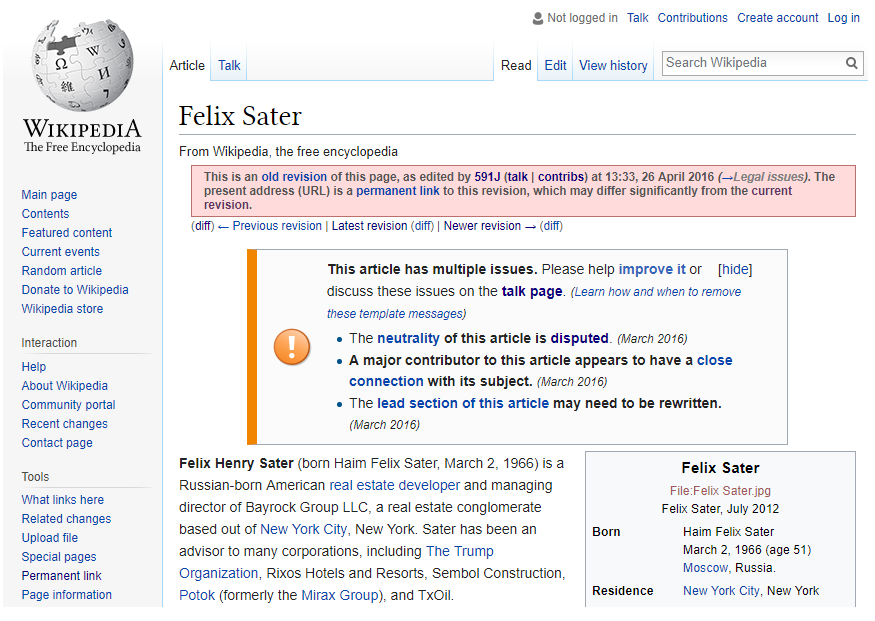 April 2016 draft of Felix Sater Wikipedia entry (source)