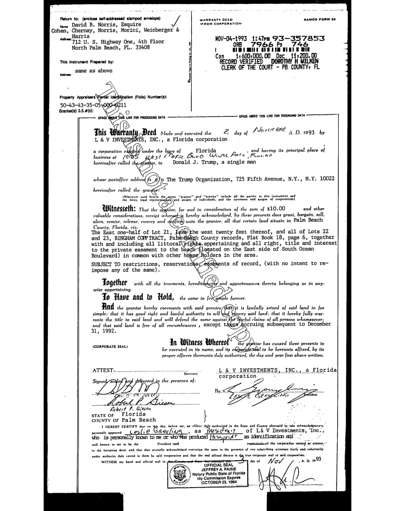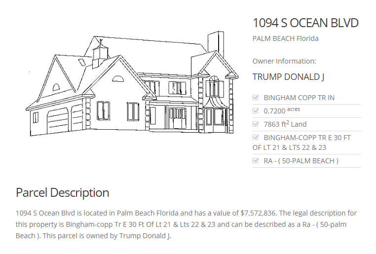 In November 1993, Donald Trump paid $1.6 million for 1094 S. Ocean Blvd, a 7,863 square-foot, marble-floored house adjacent his Mar-a-Lago estate in Palm Beach, Florida.
