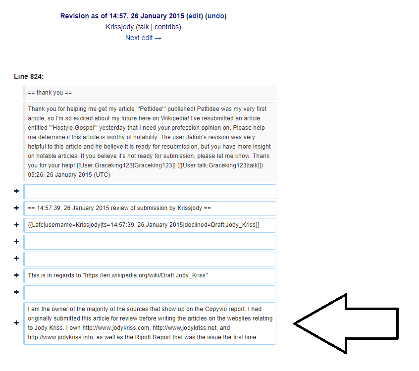 After combing through one of the sockpuppet accounts, “Krissjody,” I found the following admission: