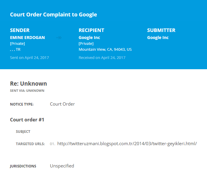 […] this week I blogged about legal efforts by Turkey’s First Lady Emine Erdoğan to scrub negative news stories about herself from the […]