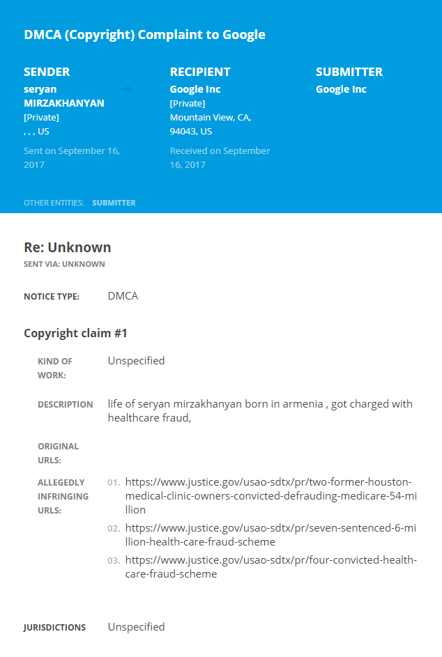 Seryan Mirzakhanyan, a 32-year-old Armenian-born scammer from California, who in 2016 was convicted of defrauding Medicare of $5.4 million, has filed at least three DMCA notices with Google requesting that the search engine delist records of the criminal scheme from the Department of Justice (DOJ) website, plus a number of news and legal document hosting sites.