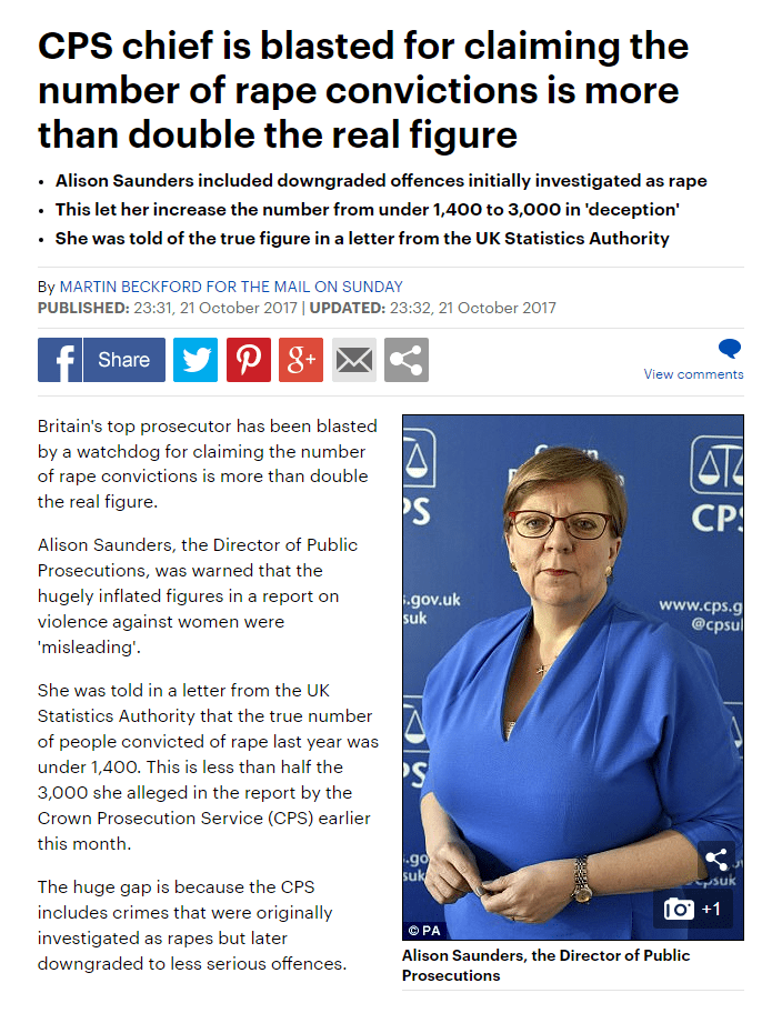 Via “CPS chief is blasted for claiming the number of rape convictions is more than double the real figure” by Martin Beckford, The Daily Mail, October 21, 2017: