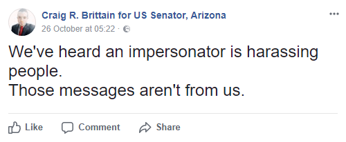Facebook deletes post criticising Arizona Senate candidate/former revenge pornster Craig R. Brittain after Brittain reports himself to website administrators