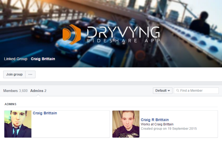 As this screenshot from June shows, Brittain’s alleged impersonator once co-managed the official Facebook group page (now deleted) for Brittain’s failed ridesharing company Dryvyng: