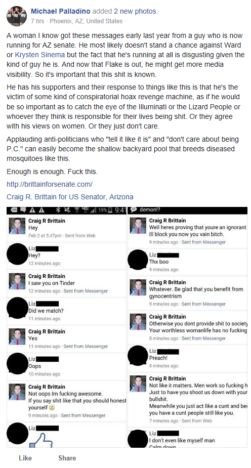 A woman I know got these messages early last year from a guy who is now running for AZ senate. He most likely doesn’t stand a chance against Ward or Krysten Sinema but the fact that he’s running at all is disgusting given the kind of guy he is. And now that Flake is out, he might get more media visibility. So it’s important that this shit is known.
