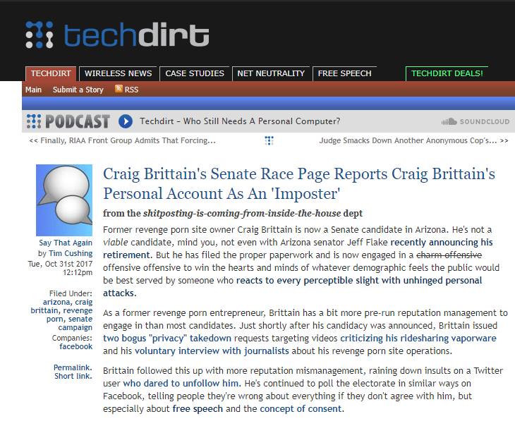 Techdirt reports my post about Arizona Senate candidate/former revenge pornster Craig R. Brittain’s most recent efforts to delete criticism about himself from the web
