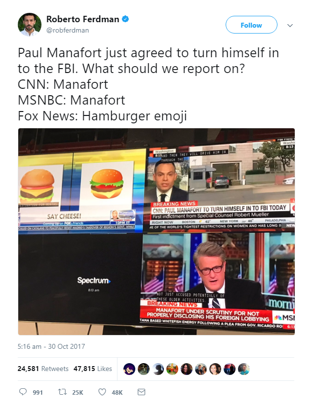 Here’s The New York Daily News reporting that “The big story at @FoxNews today isn’t Paul Manafort’s indictment – it’s the ‘emoji cheeseburger crisis’”: