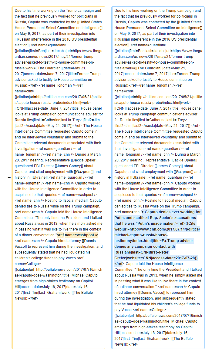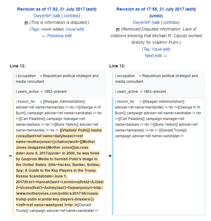 The firm also sought to add its own “properly sourced information” about Caputo, including that he “denies ever working for Putin, and scoffs at…accusations that he was ‘Putin’s image maker.’”