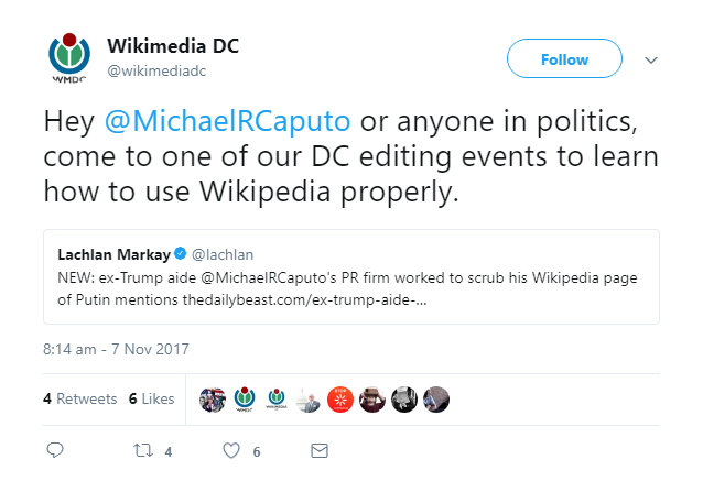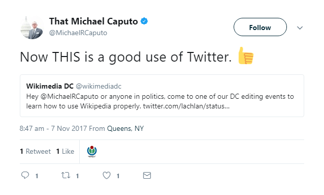 Today, Wikipedia invited Caputo “or anyone in politics” to “come to one of our DC editing events to learn how to use Wikipedia properly.”