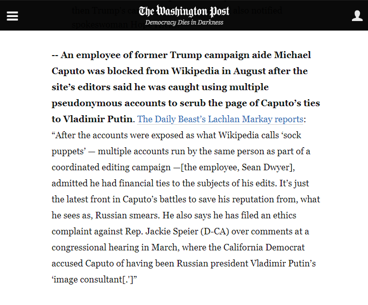 — An employee of former Trump campaign aide Michael Caputo was blocked from Wikipedia in August after the site’s editors said he was caught using multiple pseudonymous accounts to scrub the page of Caputo’s ties to Vladimir Putin. The Daily Beast’s Lachlan Markay reports: “After the accounts were exposed as what Wikipedia calls ‘sock puppets’ — multiple accounts run by the same person as part of a coordinated editing campaign —[the employee, Sean Dwyer], admitted he had financial ties to the subjects of his edits. It’s just the latest front in Caputo’s battles to save his reputation from, what he sees as, Russian smears. He also says he has filed an ethics complaint against Rep. Jackie Speier (D-CA) over comments at a congressional hearing in March, where the California Democrat accused Caputo of having been Russian president Vladimir Putin’s ‘image consultant[.’]”