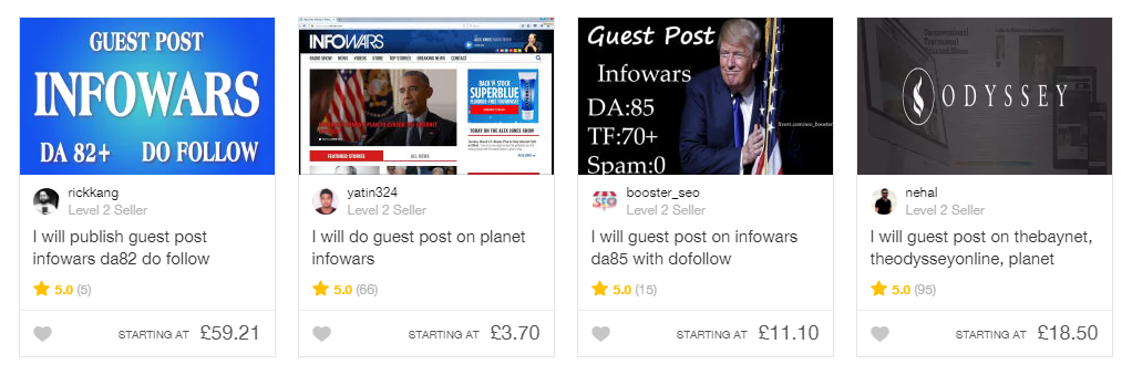 Fiverr accounts are charging up to $135 to publish sponsored content on conspiracy website Planet InfoWars