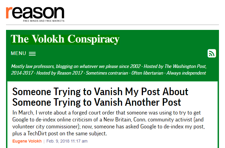 Via “Someone Trying to Vanish My Post About Someone Trying to Vanish Another Post” by Eugene Volokh, Reason, February 9, 2018:
