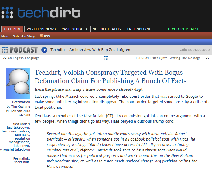 Via “Techdirt, Volokh Conspiracy Targeted With Bogus Defamation Claim For Publishing A Bunch Of Facts” by Tim Cushing, Techdirt, February 9, 2018: