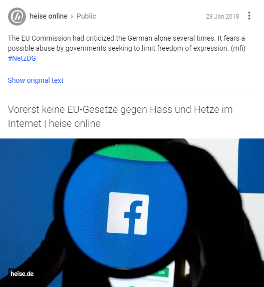 The complaint against FAZ states that the newspaper engaged in “harmful or dangerous acts” for a story about NATO, while the complaint against Heise states that the tech website engaged in “hate speech or political extremism” for publishing concerns by the EU Commission that NetzDG could lead to “possible abuse by governments seeking to limit freedom of expression.”