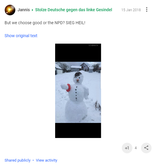 Last month, a Google Plus forum called NaziLeaks that exposes and ridicules neo-Nazis online was targeted for “discrimination, insults, defamation” and for being “extremely political.”