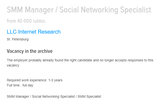 […] week, I published archived job ads for the Internet Research Agency (IRA), a pro-Putin “troll farm” based in […]