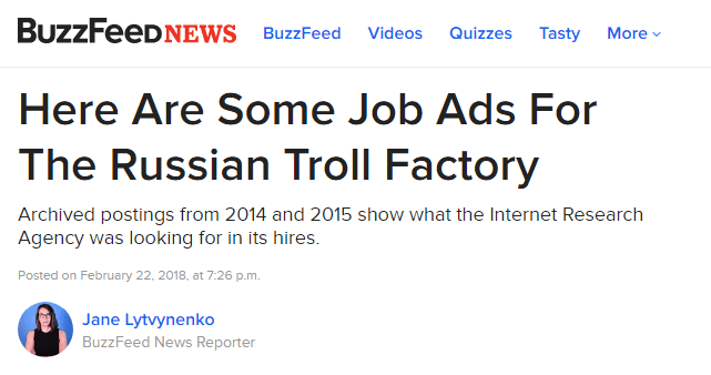 Via “Here Are Some Job Ads For The Russian Troll Factory” by Jane Lytvynenko, BuzzFeed News, February 22, 2018:
