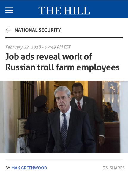 Update, via “Job ads reveal work of Russian troll farm employees” by Max Greenwood, The Hill, February 22, 2018: