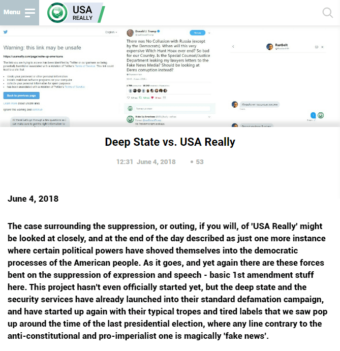 In a separate article on the campaign’s U.S. website, USAReally.com, the campaign accused “Deep State” security forces working from within the U.S. government of conspiring with journalists and social media platforms to violate its First Amendment rights.
