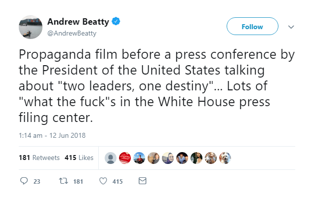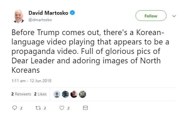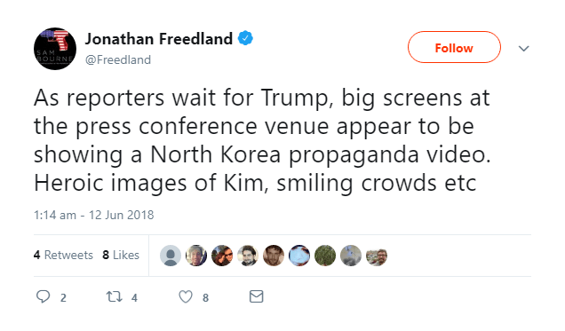 A few minutes later, Guardian columnist Jonathan Freedland tweeted: “As reporters wait for Trump, big screens at the press conference venue appear to be showing a North Korea propaganda video. Heroic images of Kim, smiling crowds etc.”