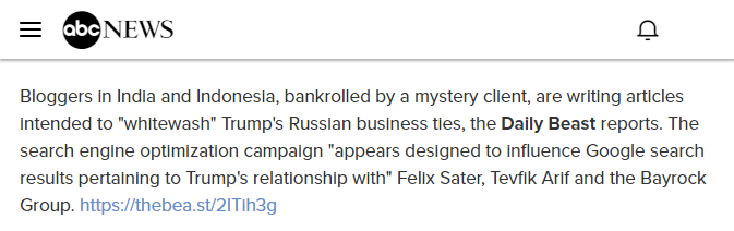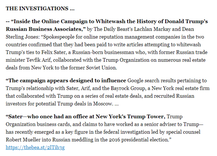 The campaign appears designed to influence Google search results pertaining to Trump’s relationship with Sater, Arif, and the Bayrock Group, a New York real estate firm that collaborated with Trump on a series of real estate deals, and recruited Russian investors for potential Trump deals in Moscow.