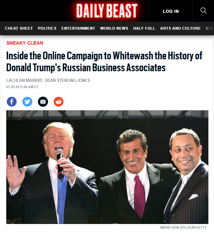 Via “Inside the Online Campaign to Whitewash the History of Donald Trump’s Russian Business Associates” by Lachlan Markay and Dean Sterling Jones, The Daily Beast, July 5, 2018: