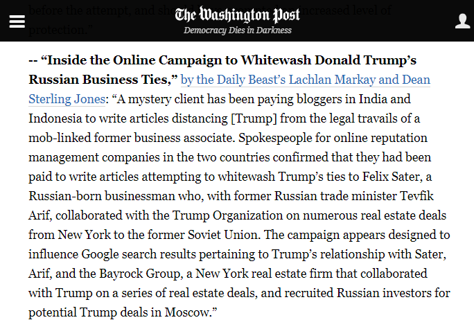 Spokespeople for online reputation management companies in the two countries confirmed that they had been paid to write articles attempting to whitewash Trump’s ties to Felix Sater, a Russian-born businessman who, with former Russian trade minister Tevfik Arif, collaborated with the Trump Organization on numerous real estate deals from New York to the former Soviet Union.