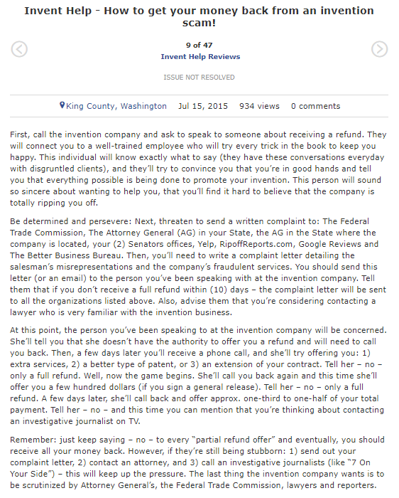 “How to get your money back from an invention scam!” wrote one anonymous reviewer, who provided a step-by-step guide on how to force InventHelp into offering a refund. “1) send out your complaint letter, 2) contact an attorney, and 3) call an investigative journalists (like “7 On Your Side”) – this will keep up the pressure. The last thing the invention company wants is to be scrutinized by Attorney General’s, the Federal Trade Commission, lawyers and reporters.”