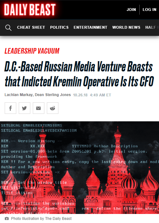 Via “D.C.-Based Russian Media Venture Boasts that Indicted Kremlin Operative Is Its CFO” by Lachlan Markay and Dean Sterling Jones, The Daily Beast, October 26, 2018: