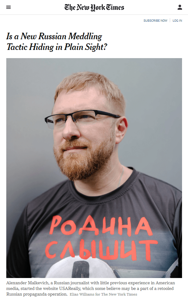 The New York Times was even less flattering in its assessment of Malkevich, describing the bumbling provocateur as being “more like a Sacha Baron Cohen character than a sinister propagandist.” In that article, Malkevich denied any connection to Russian troll operations, but refused to say who funded the USA Really website.